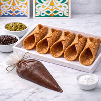 La crema al cioccolato, lavorata con cura per ottenere una consistenza cremosa e vellutata, cialde croccanti e fragranti preparate da mani esperte per garantire il perfetto equilibrio tra friabilità e resistenza. Ogni morso è un viaggio nei sapori più autentici della Sicilia.